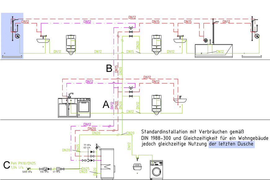 Im zweiten Haus legt man Wert auf die Möglichkeit, gleichzeitig duschen zu können. Es ist den Nutzern also klar, dass in den nächsten Jahren die Dusche im Elternbad und die im Kinderbad häufig gleichzeitig in Gebrauch sein werden. Die Dusche im Kinderbad ist daher mit einer Gleichzeitigkeit von 100 Prozent eingeplant. Die Steigleitungen für Kalt- und Warmwasser unterscheiden sich damit zu dem Standard aus der ersten Version. Etwas mehr Rohr in der Dimension DN 20, also 22 x 1, ermöglicht schon diese dann erhöhte Gleichzeitigkeit gegenüber der reinen Berechnung als Wohnhaus. Ablesen kann man die Erhöhung des Spitzenvolumenstroms übrigens am Startbauteil. Dieser beträgt für diese Annahmen bereits 1,04 l/s.