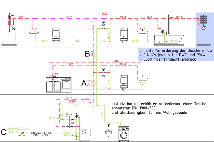 Die dritte Version beinhaltet Duschen in Vollendung. Man möchte tatsächlich mit jeweils 0,4 l/s kaltem und warmem Wasser duschen und das bei einem Fließdruck von 3000 mbar. Das ergibt dann satte 48 Liter pro Minute und fantastische Power. Eingerechnet in die gleiche Installation ergibt diese Vorgabe fette Steigleitungen in DN 25, also 28 x 1,5, für Kaltwasser und DN 20 für die warme Leitung. Man kann stundenlang darüber diskutieren, ob solche Luxusansprüche nicht übertrieben sind und vielleicht auch nicht mehr zeitgemäß. Aber letztlich ist der Kunde der König und wir sind keine Öko-Sheriffs.