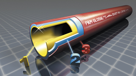 Wer kennt sie nicht, die gusseisernen Abflussrohre? Früher mit Muffe geliefert, dann von den muffenlosen SML-Rohren abgelöst. Heute heißen diese Produkte aus dem Hause Saint Gobain PAM-GLOBAL S-Rohre. Wenn man sich die Zeit nimmt, sie einmal genau zu betrachten, dann ist es nicht nur Gusseisen, was man da vor Augen hat. Die Rohre bestehen aus drei Schichten. Innen befindet sich ein Epoxidharz, dann folgt das Gusseisen. Und außen ist das Rohr mit Acryllack rotbraun gestrichen.