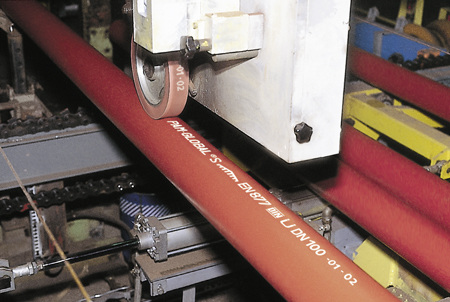 Im nächsten Bearbeitungsschritt werden die Innenflächen der Rohre mit einer Beschichtung auf Epoxidharzbasis überzogen und nachfolgend in einem Ofen vernetzt. Diese Schicht schützt das Innenleben des Rohres vor chemischen Einflüssen und macht die leicht raue Oberfläche glatt. Was dann noch folgt, ist die Außenbeschichtung mit Acryllack und das Aufbringen der Rohrkennzeichnung. Sie sichert die Rückverfolgbarkeit, falls es mit dem Rohr mal qualitative Probleme geben sollte. Damit solche Fälle aber die Ausnahme bleiben, wird jeder Meter Rohr vor der Auslieferung einer letzten Qualitätskontrolle unterzogen.