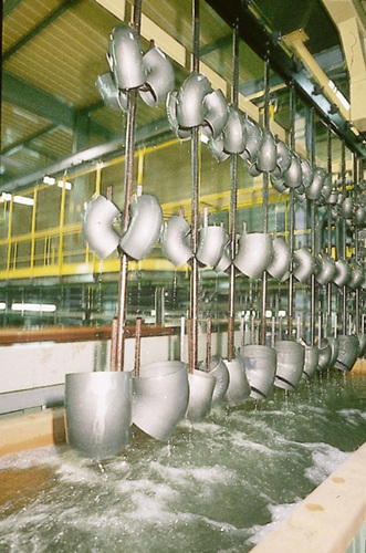 Nur mit dem Rohr allein kann man aber wenig anfangen. Denn Gussrohrbiegemaschinen hat man ja noch nicht erfunden. Bogen und Abzweige als Formstücke sind nötig. Da die eben mehr als „nur rund“ sind, können sie nicht mit dem Schleuderguss-Verfahren hergestellt werden. Sie entstehen im Sandguss-Verfahren. Hierzu verwendet man einen Gießkasten, der aus einem Ober- und einem Unterkasten besteht. Die beiden Gießkastenhälften sind mit einem Quarzsand gefüllt, der mit Bindemittel gemischt ist. In dem Sand werden Modellplatten der Formstückhälften unter hohem Druck eingeprägt. So entsteht eine Gießform, die den Außenabmessungen des Formstückes entspricht. Da Formstücke Hohlkörper sind, wird als Innenform zwischen Ober- und Unterkasten ein Kern gelegt, der den Innenraum des Formstückes ausmacht. Der zwischen Außen- und Innenform verbleibende Hohlraum entspricht etwa den Abmessungen des Formstückes – er ist ein wenig größer bemessen, weil das Metall beim Abkühlen schwindet, also geringfügig schrumpft. Dieser Hohlraum wird über den Gusstrichter und Eingusskanäle mit flüssigem Eisen gefüllt. Nach dem Entleeren der Gießform wird das abgekühlte Gussstück vom Formsand, den Kernresten und den erstarrten Eisenteilen des Eingusssystems befreit. Nach dem Putzen und Entgraten in der Abstrahlkammer und in der Schleiferei, folgt das Aufbringen der Beschichtung. PAM-GLOBAL-Formstücke werden innen und außen im kataphoretischen Tauchverfahren phosphatiert und mit einer Epoxid-Deckschicht versehen. Mit dem Tauchverfahren wird erreicht, dass auch an den Kanten der Formstücke eine Schichtdicke von 70 μm gegeben ist.