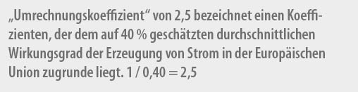 „Die 2,5 zur Ermittlung der jahreszeitbedingten Raumheizungseffizienz sind errechnet als Reziprok der Zahl 0,4. Die 0,4 steht für einen Wirkungsgrad zur Stromerzeugung in der EU von 40 %.“