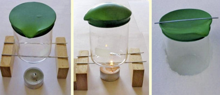 Auch Stirling konnte in der anfänglichen Entwicklung seines Motors auf für ihn bekannte Phänomene zurückgreifen. So war ihm natürlich bekannt, dass Gase sich bei Erwärmung ausdehnen und im Gegenzug bei Abkühlung wieder zusammenziehen. Die Bilder 3 bis 5 zeigen einen Glaskolben der mit einer Gummimembrane (im Volksmund: Luftballon) verschlossen wurde. Es befindet sich also ein isoliertes Gasvolumen im Kolben. In Bild 4, mit angezündeter Kerze, dehnt sich dieses Volumen unter der Wärmeeinwirkung kräftig aus. Dies ist an der nach außen gewölbten Membrane gut zu erkennen. In Bild 5 wird der gesamte Kolben in Schnee eingetaucht. Die erfolgte Abkühlung und das damit verbundene Zusammenziehen des Gases bewirkt nun eine Wölbung der Membrane nach innen. Klar wird jetzt schon: Durch das äußere Erwärmen und Abkühlen wird eine Bewegung erzeugt. Ein ständiges Auf und Ab der Membrane kann allerdings nur erreicht werden, wenn der Glaskolben abwechselnd erwärmt und abgekühlt wird. Das, quasi als sich wiederholenden Prozess (Kreisprozess) zu erreichen, ist schwierig. Denn wer läuft schon gerne zwischen Kerzenständer und Schnee hin und her nur um eine Bewegung in einem isolierten Gasvolumen zu erzeugen?