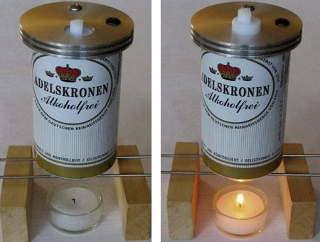 Es ist nicht sehr wahrscheinlich dass Stirling leere Bierdosen eines alkoholfreien Bieres (wie in den Bildern 6 und 7) zur Weiterentwicklung seiner Idee nutzte. Dennoch ist die Leitfähigkeit einer Alu-Dose hervorragend geeignet, den Prozess zu verfeinern und in die Tat umzusetzen. Der Deckel auf der Dose dient erstmal nur zur Aufnahme eines kleinen Kolbens (in weiß) und zur Kühlung. Wird unterhalb der Dose, wie beim Glaskolben, ein Feuerchen angezündet, so dehnt sich das in der Dose enthaltene Gas aus. Dabei hebt der Gasdruck den Kolben an (Bild 7) und so wird ein Teil der zugeführten Wärmeenergie in mechanische Ausdehnungsarbeit umgewandelt.