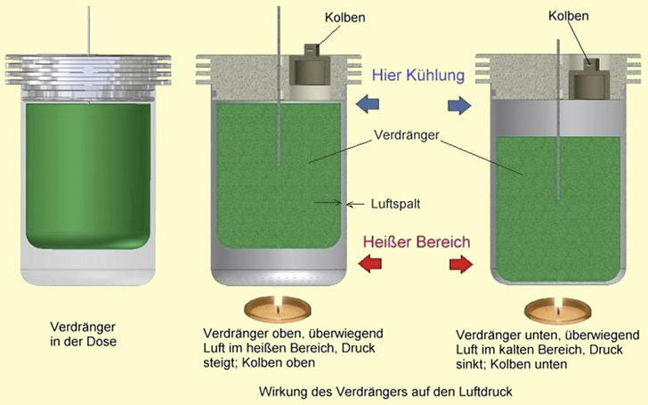 Würde man also neben der Bierdose sitzen bleiben und den Verdrängerkolben ständig in einem guten Rhythmus eintauchen und dann wieder hochziehen, so würde auch der Arbeitskolben ständig auf und ab fahren. Die eigentliche Arbeit am Arbeitskolben würde aber nicht durch die leichtgängige Betätigung des Verdrängerkolbens geleistet, sondern durch die immer wiederkehrende Erwärmung und Abkühlung des Gases in der Dose. Die monotone Arbeit des „Auf“ und „Ab“ am Verdrängerkolben gilt es jetzt noch an jemanden weiterzugeben der sich ohnehin gerade bewegt. Mit dem naheliegenden Trick die Bewegung des Arbeitskolbens mit dem des Verdrängerkolbens zu kombinieren ist der Stirlingsche Motor schon fast fertig erfunden.