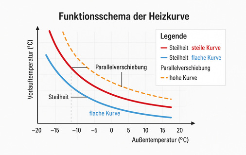 In der Praxis bestimmen Steilheit und Parallelverschiebung die Heizkurve. Moderne Regler bieten darüber hinaus weitere Parameter. Die Steilheit gibt an, wie stark die Vorlauftemperatur bei sinkender Außentemperatur ansteigt. Die Parallelverschiebung verschiebt die gesamte Kurve nach oben oder unten.