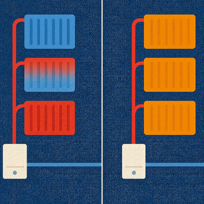 Ohne hydraulischen Abgleich nehmen sich die Heizkörper einfach das Wasser, das sie bekommen können. Das Problem: Heizkörper in der Nähe des Kessels werden überversorgt und werden heiß, während entfernte Heizkörper unterversorgt und kalt bleiben. Das kennst du sicher aus der Praxis: der erste Heizkörper glüht, der letzte bleibt lauwarm.