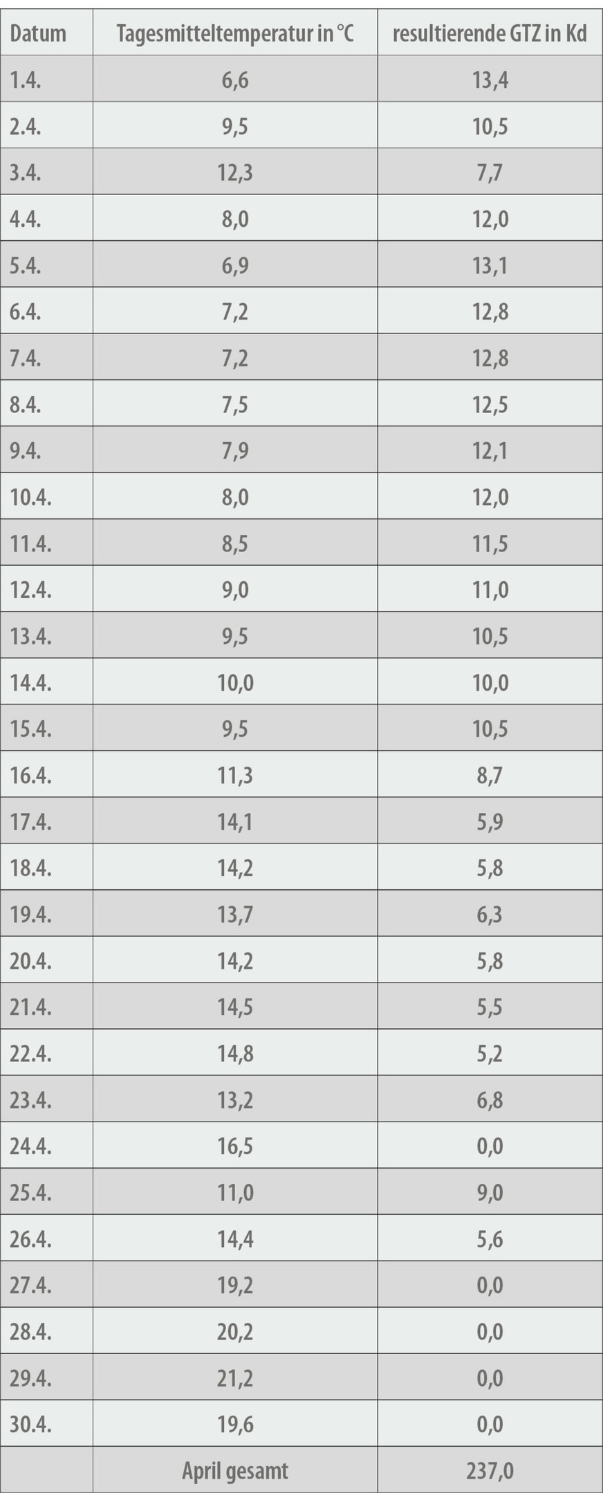 Die GTZ beträgt für diesen Monat also 237,0. Und obwohl beispielsweise am 24.4. eine Differenztemperatur von 3,5 (20 minus 16,5) rein rechnerisch nachzuweisen ist, wird dieser nicht mit aufgenommen, da ja die Heizgrenztemperatur von 15 °C an diesem Tage im Durchschnitt überschritten wurde.