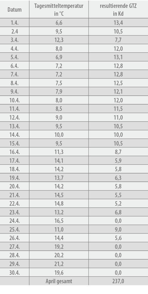 Die GTZ beträgt für diesen Monat also 237,0. Und obwohl beispielsweise am 24.4. eine Differenztemperatur von 3,5 (20 minus 16,5) rein rechnerisch nachzuweisen ist, wird diese nicht mit aufgenommen, da ja die Heizgrenztemperatur von 15 °C an diesem Tage im Durchschnitt überschritten wurde.