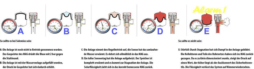 Anhand der Beschreibung des Wohnhauses der Familie Solemio konnten Sie schon erahnen, dass der Weg vom Kollektor zum MAG für eine ausreichende Kühlung der durch Dampf vertriebenen Solarflüssigkeit sorgt. Das heißt, im Kollektor entsteht bei Stagnation an einer Stelle eine Dampfblase und schiebt das noch flüssige Fluid der Rohrleitungen ins MAG.