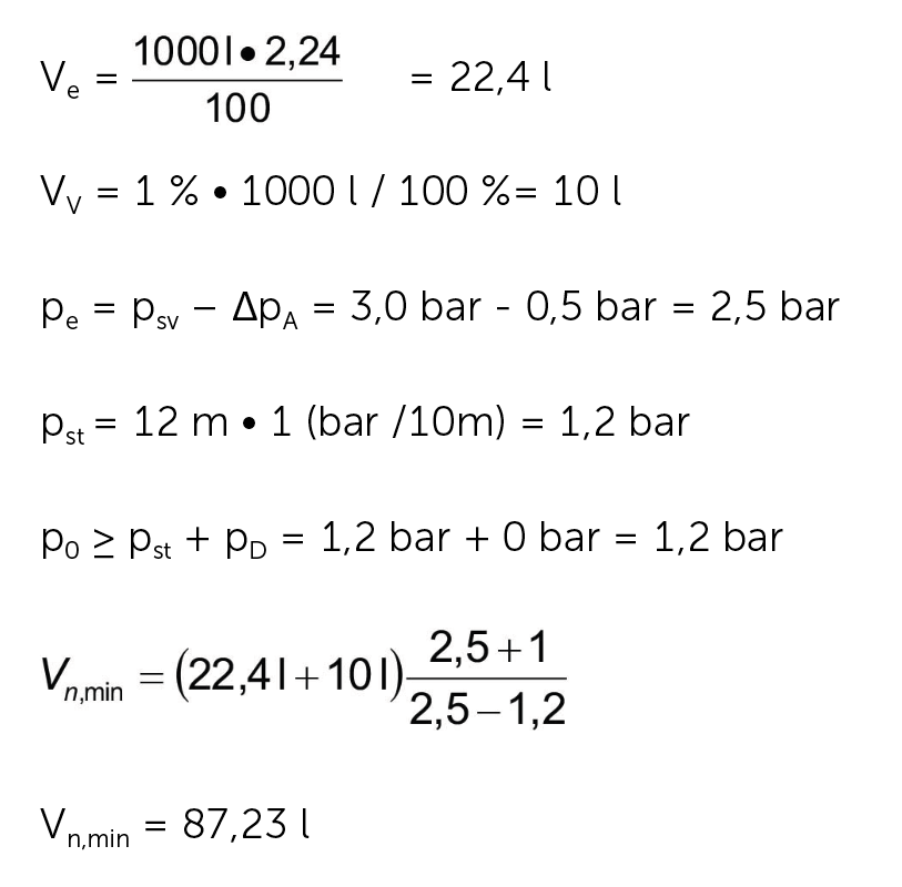 Rein rechnerisch würde also ein MAG mit einem Volumen von 87,23 Liter ausreichen, um die Anforderungen zu erfüllen. In den Herstellerlisten findet man als nächstgrößeres ein Gefäß mit 100 Liter Volumen und dieses wird ausgewählt.