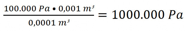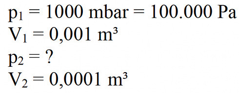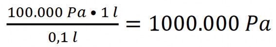 Wen wundert es, dass der Druck auf das Zehnfache ansteigt, wenn das Volumen um das Zehnfache verringert wurde? Die Einheit des Volumens hätte übrigens auch locker und korrekt in Liter ausgedrückt werden können. Das Ergebnis bliebe gleich.
