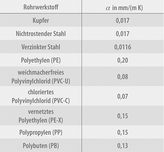 Der Wärmeausdehnungskoeffizient ist dabei eine materialspezifische Größe. Abhängig vom Rohrmaterial dehnt sich dieses also unterschiedlich stark aus. Die nachfolgende Tabelle zeigt einige Beispiele für gebräuchliche Rohrwerkstoffe: