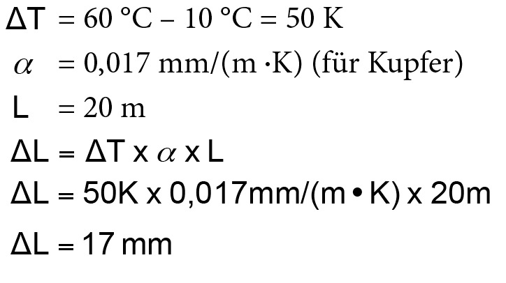 Das bereits angesprochene Beispiel von der Heizungsleitung unter der Kellerdecke mit einer Länge von 20 Metern und einer Erwärmung von 10 °C auf 60 °C soll hier beispielhaft durchgerechnet werden: