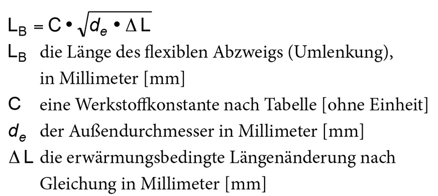Die Länge des flexiblen Abzweigs sollte rechnerisch also mindestens 2020 mm betragen. Angesichts der Tatsache, dass sich das Kunststoffrohr gegenüber dem Kupfer um fast 12-mal stärker ausgedehnt hat, ist der freie Schenkel nur 1,5-mal so lang. Das Kunststoffrohr lässt sich nun mal mit geringerem Kraftaufwand knicken als ein vergleichbares Kupferrohr.