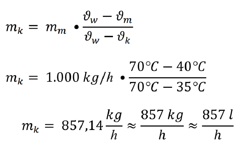 Mittels der Mischwasserformel lässt sich noch ausrechnen, welchen Anteil das heiße Kesselwasser mit 70 °C haben wird und welcher Volumenstrom aus dem kühlen Rücklauf mit 35 °C stammt.