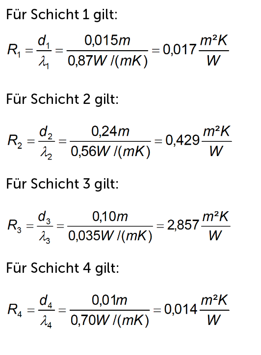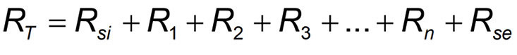 Umgangssprachlich könnte man sagen: Addiere alle Einzelwiderstände zu einem Gesamtwiderstand (RT) auf. Die Einzelwiderstände setzen sich zusammen aus dem ersten (Rsi) und letzten (Rse) vom gleichen Typ, nämlich dem Übergangswiderstand. Dann kommen noch die „Schichtwiderstände“ von Schicht 1 (R1) Schicht 2 (R2) bis zur letzten (n-ten, sprich „Enten“) Schicht (Rn). Die Grundformel legt sich nicht fest in Bezug auf die Anzahl der Schichten. Es können drei Schichten sein (Gipsplatte, Dämmung, Gipsplatte) oder deutlich mehr.