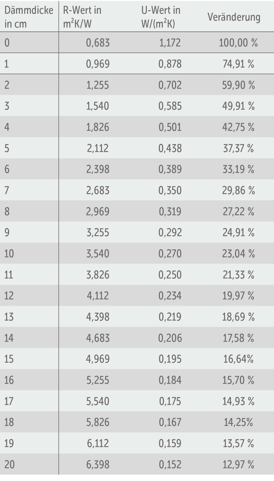 In der nachfolgenden Tabelle steht in der ersten Zeile diese Wand mit R- und U-Wert als Basis.