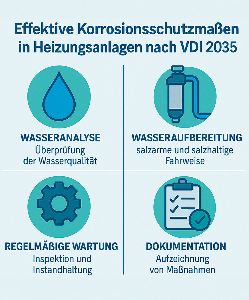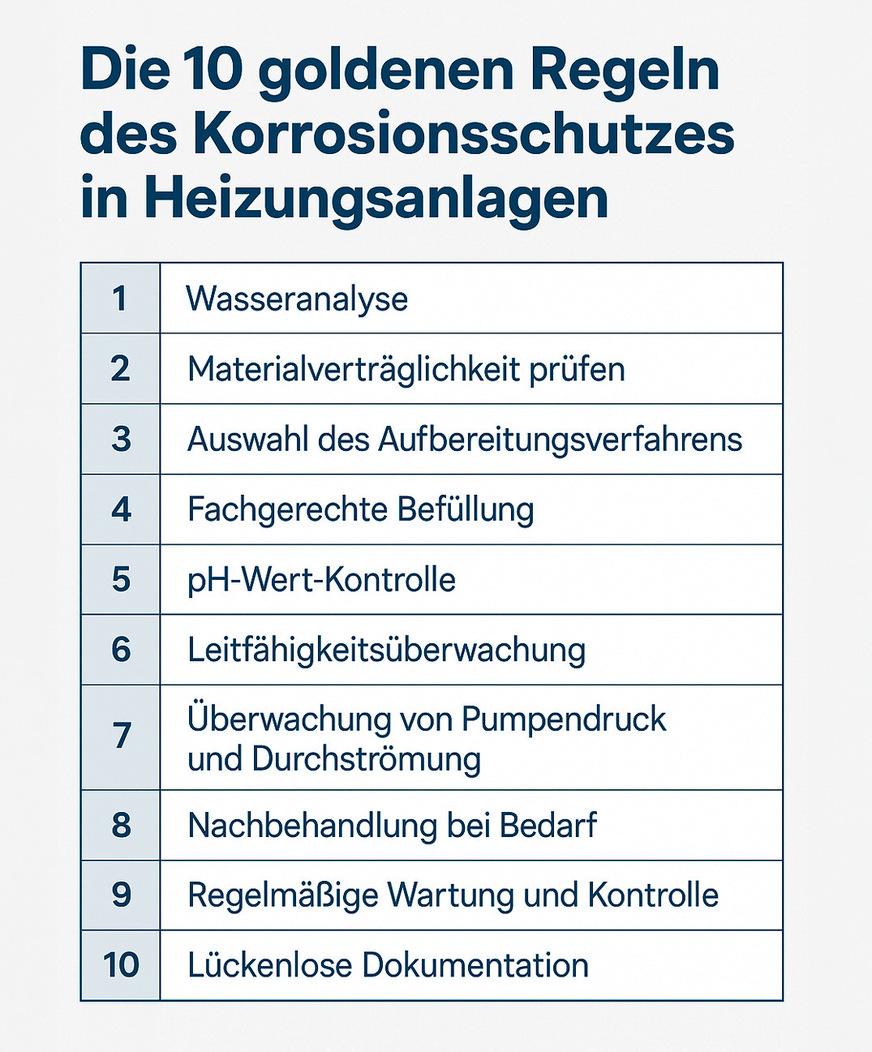 Korrosionsschutz ist wie Zähneputzen – einmal ist keinmal. Du brauchst ein System aus mehreren Bausteinen: Erstens das System dicht halten, zweitens die Wasserqualität sicherstellen, drittens chemisch nachhelfen wo nötig. Jeder Baustein für sich ist wichtig, aber erst zusammen ergeben sie einen wirksamen Schutz.