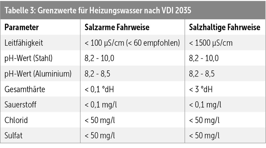 Die zulässige Härte richtet sich nach dem spezifischen Anlagenvolumen: < 0,8 °dH bei V ≤ 20 l/kW, bis max. 3 °dH erst bei V ≥ 50 l/kW (VDI 2035 Blatt 1, Tabelle 1).