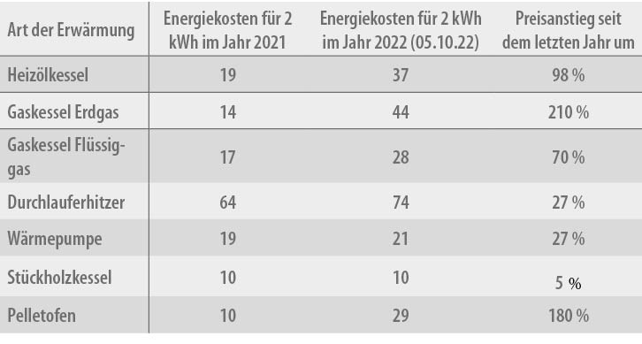 Das entspricht dem Energiegehalt von rund 0,2 Litern Heizöl oder 0,2 Kubikmetern Erdgas, 500 Gramm Scheitholz oder 400 Gramm Pellets, 2 Kilowattstunden (kWh) Strom im Durchlauferhitzer oder 0,6 kWh Stromeinsatz bei einer Wärmepumpe.