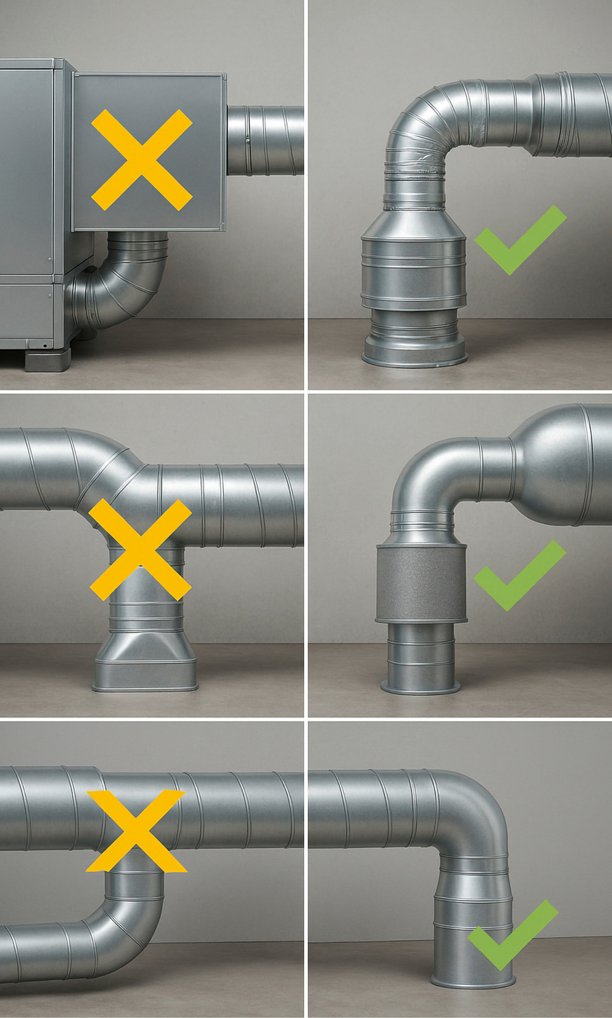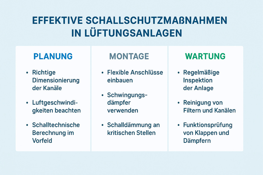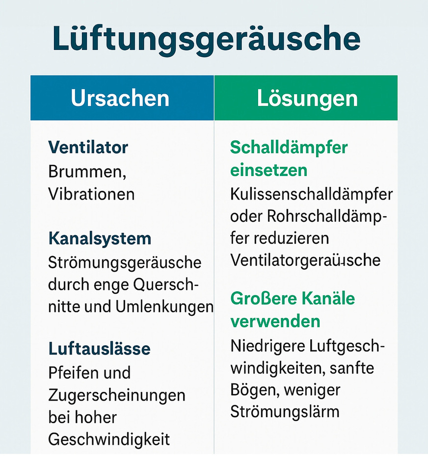Lösung: Größere Kanalquerschnitte, strömungsgünstige Formteile, Schalldämpfer nachrüsten