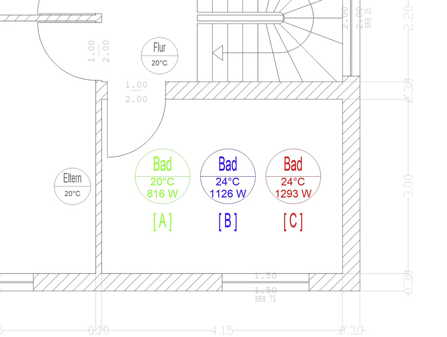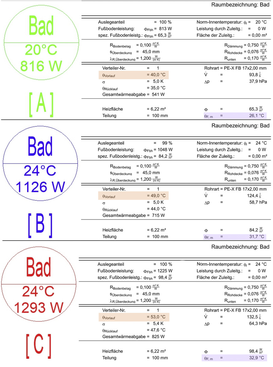 Eine dritte Variante ist durchgerechnet mit 24 °C für das Bad und nicht voll beheizten Nachbarräumen. Ansonsten sind die Vorgaben für diese drei Varianten identisch.