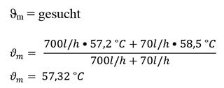 Am Eingang der Zirkulationsleitung aus den Steigeleitungen zurück in die waagerechte Kellerleitung mischt sich der Volumenstrom von 700 l/h bei 57,2 °C aus der liegenden Teilstrecke mit 70 l/h aus dem Steigestrang bei 58,5 °C. Welche Mischtemperatur stellt sich auf dem Weg in Richtung Trinkwassererwärmer ein?