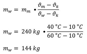 Während der Duschzeiten am Morgen sollten also insgesamt 240 Liter Warmwasser mit 40 °C bereitgestellt werden. Rechnet man ohne Nachheizung, so wird sich aus 150 Litern Heißwasser mit 60 °C eine bestimmte Menge an Mischwasser herstellen lassen. Der Vergleich gibt Aufschluss über die Realisierbarkeit.