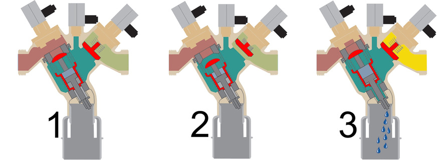 Der Systemtrenner wird also in den Zufluss zwischen dem Trinkwassersystem und der im Beispiel beschriebenen Heizungsanlage eingesetzt. Im Ruhezustand (Bild 1) befinden sich die drei federbelasteten Ventile in Ruhestellung auf ihrem Ventilsitz und verschließen sämtliche Öffnungen. Wird in Fließrichtung hinter dem rechten Ventil eine Zapfstelle geöffnet, so fällt der Druck und dieses rechte Ventil öffnet sich. In der Folge sinkt der Druck im Ventilinnenraum (hier in grün) und auch das linke Ventil öffnet sich. Das untere Ventil bleibt geschlossen (Bild 2). Das Wasser strömt also durch den nach unten geschlossenen Ventilinnenraum und befüllt die Heizungsanlage. Fällt der Druck auf der linken Seite des Systemtrenners (Trinkwasserseite) gegenüber dem Druck auf der rechten Seite (Heizungsanlage), so könnte sich Wasser zurückdrücken. Dies entspricht dem Szenario in der eben beschriebenen Dachheizzentrale. Jetzt schließt sich aber das linke Ventil aufgrund der Druckverhältnisse. Gleichzeitig öffnet sich kurz das unten liegende Ventil, das auch Ablassventil genannt wird. Das Heizungswasser wird abgelassen (Bild 3). Anschließend sind sämtliche Ventile wieder geschlossen.