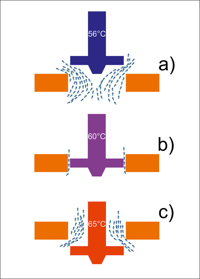 Wird also eine thermische Desinfektion durchgeführt, geht das Ventil bei steigender Temperatur in eine starke Drosselstellung, da der Dehnkörper für eine Verengung des Durchflusses sorgt. Doch auch während der stärksten Drosselung fließt noch heißes Wasser durch das Ventil. Der Dehnkörper erfährt also eine Ausdehnung über 60 °C hinaus.