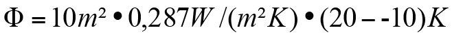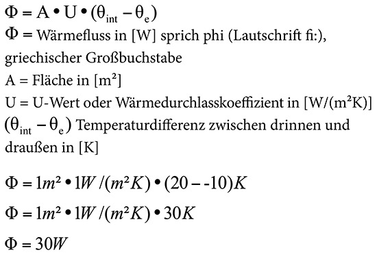 Man könnte jetzt beliebige andere Flächen, U-Werte oder Temperaturdifferenzen einsetzen und sicher voraussagen, welche Leistung an diesem Bauteil abfließen würde und folglich auch durch einen Heizkörper oder eine Fußbodenheizung erbracht werden müsste.
