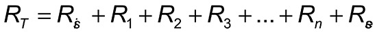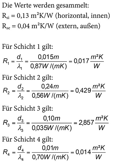 In Worten könnte man sagen: Addiere alle Einzelwiderstände zu einem Gesamtwiderstand (RT) auf. Die Einzelwiderstände setzen sich zusammen aus dem ersten (Rsi) und letzten (Rse) vom gleichen Typ sowie die „Schichtwiderstände“ 1 (R1) bis zur letzten (n-ten sprich Enten) Schicht (Rn). Die als Übergangswiderstände bezeichneten Rsi und Rse ergeben sich aus Tabellen.