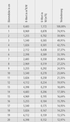 In der nachfolgenden Tabelle steht in der ersten Zeile diese Wand mit R- und U-Wert als Basis.
