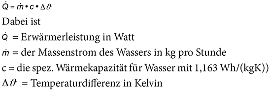 Die Erwärmerleistung eines elektrischen Durchlauferhitzers ergibt sich aus dem Massenstrom des Wassers multipliziert mit der spezifischen Wärmekapazität von Wasser und nochmals multipliziert mit der Temperaturdifferenz zwischen kaltem und erwärmtem Wasser.