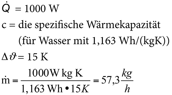 Mein Massenstrom hat sich aber erheblich verändert. Man könnte jetzt schon ahnen, dass bei einem Drittel der ursprünglichen Spreizung von seinerzeit 15 K nun, bei nur noch 5 K Spreizung, der dreifache Massenstrom notwendig sein wird. Die Nachrechnung bestätigt diese Annahme: