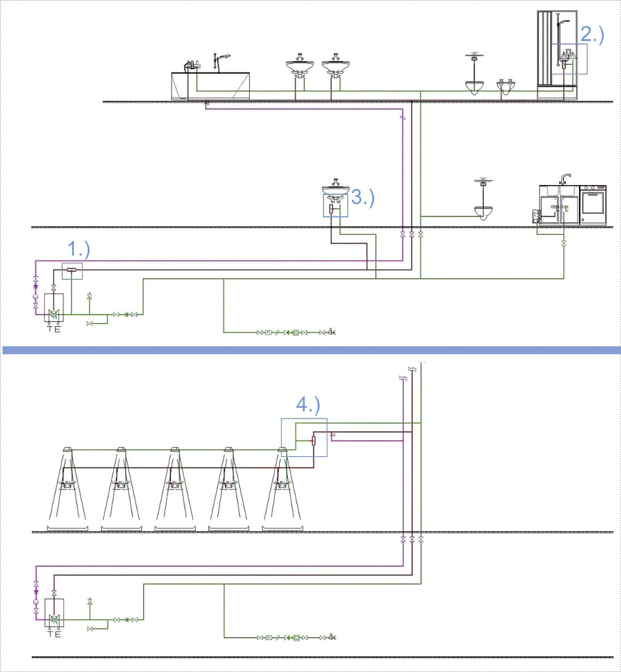 Beispielsweise innerhalb des verzweigten Trinkwassersystems einer Sportanlage sollen hygienefördernde hohe Temperaturen von um die 60 °C die Legionellen im Schach halten. Eine Regelarmatur, die eine Wassertemperatur der Zirkulationsleitungen zu sehr beschneiden würde, wäre sicherlich nachteilig für die Hygiene. Allerdings können in den Duschanlagen keine Temperaturen geduldet werden, die Verbrühungen der Nutzer nach sich ziehen könnten. Hier wäre es möglich, wiederum einzelne Thermostatbatterien zu installieren. Der finanzielle Aufwand dafür wäre entsprechend hoch.