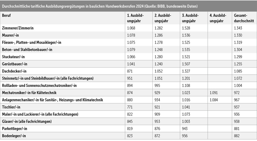 Allerdings ist das nur die eine Seite der Medaille, denn im Handwerk ist das Gefälle bei den tariflichen Ausbildungsvergütungen besonders groß. In 15 Berufen wurden tarifliche Ausbildungsvergütungen von im Durchschnitt mehr als 1100 Euro gezahlt. In sieben dieser Berufe, die alle zum Baubereich gehören, lagen sie sogar über 1300 Euro. Dazu gehören Zimmerer, Maurer, Fliesenleger, Beton- und Stahlbetonbauer sowie Straßenbauer.