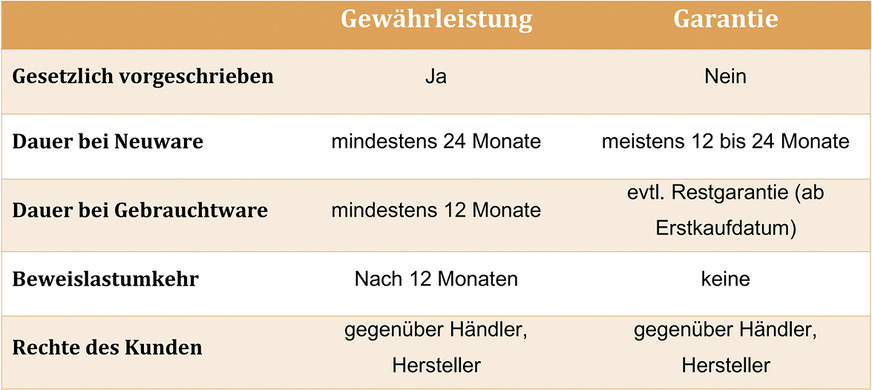 Die gesetzliche Gewährleistung wird im Juristendeutsch auch Mängelhaftung genannt. Denn sie greift automatisch, wenn eine gekaufte Ware einen Mangel aufweist. Die Gewährleistungsfrist bei Neuwaren beträgt mindestens zwei Jahre, bei Gebrauchtwaren ist es mindestens ein Jahr.